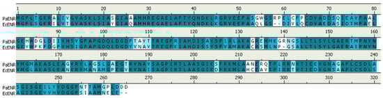 Pairwise protein sequence alignment of ENR from P. aeruginosa (PaENR) with ENR from E. coli (EcENR). Alignment was performed by Discovery Studio Visualizer 2.0 (Accelrys) and conserved residues are shown in dark blue with a white background.