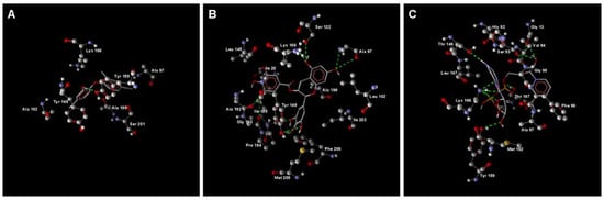 Hydrogen bond interaction analysis by Molegro Molecular Viewer. A: PaENR-triclosan; B: PaENR-EGCG; C: PaENR-NADH.