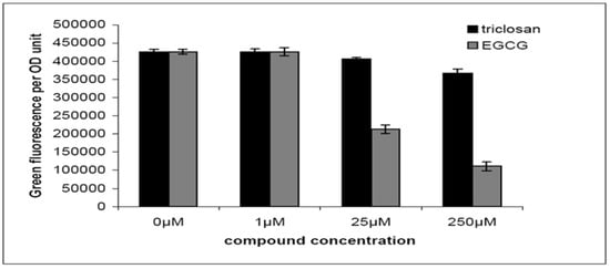 To test our proposal we examined the quorum-quenching capabilities of triclosan and EGCG by means of a quorum-quenching assay based on a lasB::gfp(ASV) translational fusion in P. aeruginosa wild-type PAO1 strain [31]. In this assay an unstable version of Gfp (ASV) was fused with the QS regulated LasB protein, by which the P. aeruginosa QS activity can be indicated by measuring green fluorescence per OD600 unit. As shown in Figure 3, triclosan showed a slight reduction in green fluorescence per OD unit, while EGCG showed significant reduction in green fluorescence per OD unit. Both triclosan and EGCG showed no growth inhibition of P. aeruginosa PAO1 strain under our tested concentrations. This suggests that EGCG is an active quorum-quenching reagent.