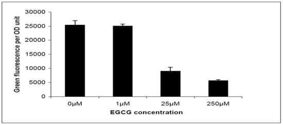 Expression of pqsA:gfp(ASV) in wild-type P. aeruginosa treated with EGCG. Results are average values of green fluorescence divided by OD600 taken from a single time point measurement corresponding to maximal induction of the reporters in the late log phase of growth. Inhibitors were added at concentrations of 0 µM, 1 µM, 25 µM and 250 µM. Averages and SDs of three replicates are shown.