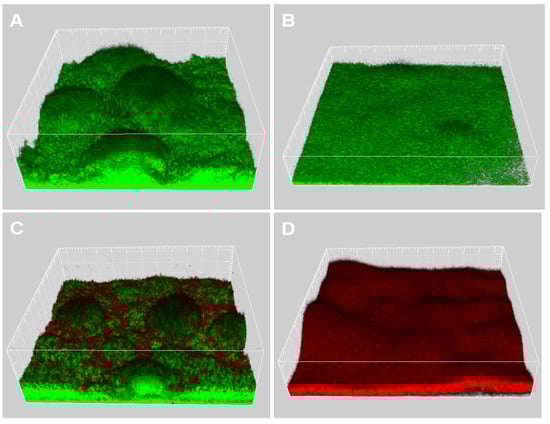 4-days-old biofilms of Gfp-tagged wild-type grown in FAB medium without (A) or with 25 µM EGCG (B). Biofilms were further treated with 50 µg/ml ciprofloxacin for 24 h (C: biofilm grown in FAB without EGCG; D: biofilm grown in FAB with 25 µM EGCG), after which they were stained with propidium iodide and images were acquired by CLSM. Live cells appear green and dead cells appear red.
