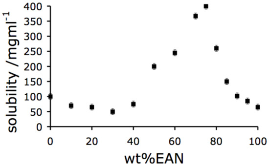 The phase diagram for the binary system, EAN + water, is very simple. It features only a simple eutectic at -36 ºC at a composition of 30 mole % EAN. The ambient temperature solubility of HEWL in EAN-H2O solutions of various compositions is shown in Figure 1. The solubility of HEWL in this binary mixture is complex. At the anhydrous limit, the solubility of HEWL is 100 mg/mL, comparable with that in pure water. Upon addition of water to the anhydrous EAN, the solubility increases (as noted previously [22]) until a maximum at a remarkable 400 mg/mL (four time larger than the solubility of HEWL in pure water) is reached at a solvent composition of 25 wt % water. This corresponds to 33 mol% EAN, or one water molecule for each ion. At a protein content of 400 mg/mL the solution is approximately 30 vol. % protein.