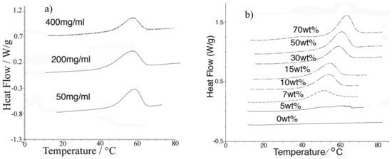 Figure 2b shows the DSC traces of the thermal unfolding of HEWL in various EAN/water mixtures, (wt % water) at the maximum HEWL solubility for each solvent composition as it appears in Figure 1, wt % scale. The thermal stability of the protein at each water content is indicated by the value of the denaturation temperature: we have not carried out the refoldability test in these cases. Except for the lowest water contents, the endotherms all indicate two-state cooperative refolding. The absence of any endotherm at all in the case of anhydrous EAN shows that HEWL is denatured in the absence of water, though (as shown elsewhere [27]), it can refold into the bioactive form on dilution to biological concentrations. With 5 wt % of water present, a very small endotherm (of shape incompatible with cooperative unfolding according to the van’t Hoff evaluation), is seen. By 10 wt % water, an endotherm of the two-state cooperative shape is observed, and this shape is retained at all other solvent compositions.