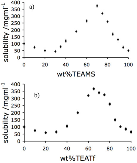 Figure 3 shows the equivalent of Figure 1 for two additional cases in which the EAN of the Figure 1 system is replaced by trimethylammonium methanesulfonate (TEAMS) in one case and by triethylammonium triflate (TEATf) in a second. Both have been components in previous studies of proteins dissolved in hydrated ionic liquids reported by this laboratory [26]. The HEWL solubility curves of all three systems are similar, with minimum solubilities near 75 wt % water and maximum values near 30 wt % water. We have established by proton magnetic resonance studies [25] that these solutions have proton activities (effective pHs determined by the state of the proton transferred in PIL formation) that differ from that of the equivalent EAN solution. The effective acidity goes as the mean of the pKas of the acid and base that generate the PIL. Accordingly, TEAMS and TEATf will optimally stabilize proteins that, in aqueous solution, are known to be more acidophilic than lysozyme.