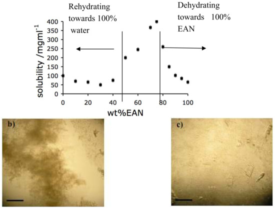 a) Solubility curve for HEWL dissolved in EAN/water solutions, illustrating the two approaches (“rehydration” and “dehydration”) to protein crystallization that have been tested in the present work. b) Optical micrograph of aggregated protein resulting from the use of NaCl as the precipitating additive. c) Optical micrograph of the product of the dehydration crystallization method when PEG is used as the precipitating additive: both small protein crystals and aggregated protein are in evidence.