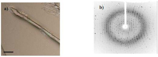 (a) Optical micrograph of a HEWL crystal produced by the rehydration method (b) X-ray diffraction pattern obtained for the crystal shown in (a). Scale bar is 50 μm.