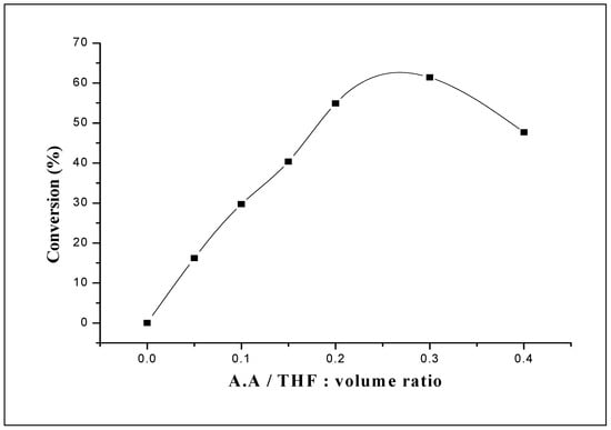 The results of THF polymerization induced by 0.1 g of 12-tungstophosphoric acid in bulk during 1.5 h are reported in Figure 2 and Table 2. It can be seen from these results that the value of the conversion depends on the AA proportion. In fact, when the AA/THF volume ratio varies from 0 to 0.25 the conversion increases from 0% to 60%, then after that it decreases. The decrease of the conversion at high AA proportions might be due to consumption of the heteropolyacid protons by the acetic anhydride leading to acetic acid (a weak acid). In fact, when the reaction was performed without the catalyst but with acetic acid, no polymer was obtained. It is also noteworthy that the polymerization does not occur in the absence of AA. The decrease of the conversion at high acetic anhydride proportions is due to an increase in the number of methyl groups at the extremities of the chains which blocks the polymer chain growth.