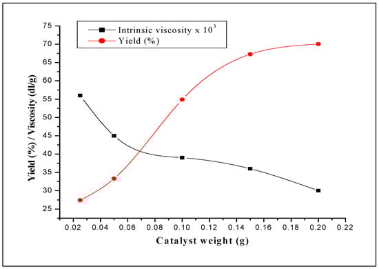 Figure 4 illustrates the results of the effect of the amount of the catalyst on the polymerization. It can be seen from this figure that the conversion increases as the amount of H3PW12O40·13H2O increases. This is probably the result of an increase in the number of initiating active sites responsible for inducing polymerization, which is proportional to the amount of catalyst used in the reaction. It can be seen also from this figure that when the amount of the catalyst increases, the conversion increases, whereas the intrinsic viscosity of the Poly(THF) decreases. In fact, when the amount of catalyst was varied from 0.025 g to 0.2 g, the conversion increased from 27.4% to 70.1% whereas the intrinsic viscosity decreased from 0.056 to 0.030 dL/g. It can be seen from Figure 4, that at higher amounts of catalyst, the conversion decreases slightly. The decrease of the intrinsic viscosity with increasing the catalyst amount can be explained by the fact that the monomer to initiator ratio is altered, i.e, fewer monomer units are available per propagating polymer. The number of initiating active centers responsible of inducing polymerization is prorate to the catalyst amount used in the reaction. Similar results were obtained by Yahiaoui et al. [26] in the polymerization of cyclohexene oxide by a montmorillonite sheet silicate clay, exchanged with proton, H-Maghnite (Brønsted solid acid catalysts). Like the molecular weight, the Tm decreases with the increase of the amount of catalyst (Figure 5).