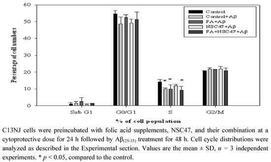 As oxidative stress may signal modulation of the cell cycle of dividing cells, we further investigated the effect of folic acid or/and NSC47 on the cell cycle of Aβ-treated C13NJ cells. Figure 5 shows that Aβ challenge significantly reduced the percentages of cells in the S phase (the phase of DNA synthesis), suggesting that Aβ-induced cytotoxicity of C13NJ cells may be partially mediated by affecting DNA synthesis. Preincubation of Aβ-induced C13NJ cells with NSC47, but not with folic acid or the combined regimen, restored the proportions of S-phase cells back to the value of control cells.