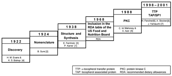 - Evans, H.M.; Bishop, K.S. On the existence of a hitherto unrecognized dietary factor essential for reproduction. Science 1922, 56, 650–651. [Google Scholar]