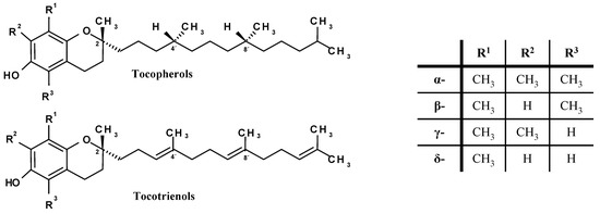 Vitamin E consists of a mixture of tocopherols and tocotrienols that are synthesised by plants from homogenestic acid. All are derivatives of 6-chromanol with an aliphatic side-chain. The four tocopherol homologues (α-, β-, γ-, δ-) have a fully saturated 16-carbon isoprenoid side-chain, whereas tocotrienols have a similar isoprenoid chain containing three double bonds. Individual tocopherols are named according to the position and number of the methyl groups on the phenol ring, with the α-, β-, γ- and δ- vitamins containing three, two, two and one methyl groups respectively (Figure 2). These structural differences determine the biological activity, with α-homologues being the most biologically active [10].