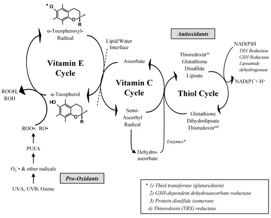 The antioxidant network showing the interaction among vitamin E, vitamin C and thiol redox cycles (according to [9]) © American Society for Nutrition); PUFA: polyunsaturated fatty acid, ROOH: lipid peroxide, ROH: alcohol, ROO•: peroxyl radical; RO•: alkoxyl radical, O2•−: superoxide anion radical, NAD(P)H: nicotinamide-adenine-dinucleotide-(phosphate).