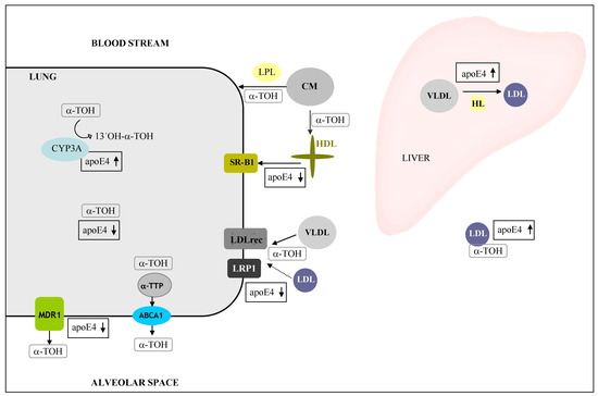 Proteins involved in the metabolism of α-tocopherol (α-TOH) in the lung. α -tocopherol is distributed in the body via different lipoproteins and chylomicrons (CM). Cellular uptake of α-TOH is mediated by apoE and lipoprotein lipase (LPL) activity and their binding to several lipoprotein receptors including peripheral tissues (e.g., lung)receptor (LDLrec) and LDL receptor related protein 1(LRP1). Intracellular α-TOH is subjected to mitochondrial degradation by the cytochrome P450 family 3A (CYP3A) enzyme subfamily. Delivery of α-TOH to the alveolar space is facilitated by the activity of the α-tocopherol transfer protein (α-TTP) and ATP-binding cassette A1 (ABCA1). Excessive amounts of α-TOH may be also excluded via the multidrug resistance transporter 1 (MDR1) (according to [68]).