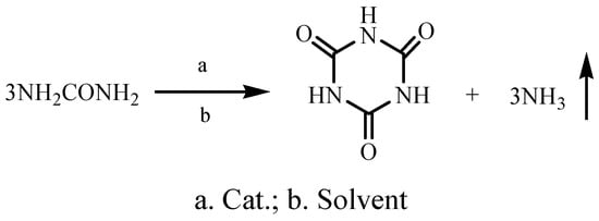 There are two ways for preparing cyanuric acid from urea. One is by heating urea at high temperature (≥ 250 °C) without solvent, and the other is the trimerization of urea in a solvent, with or without a catalyst [,,,]. The first method has the disadvantage that since the reaction product changes from a solid phase to a liquid phase and back again to the solid phase, so it may be agglutinated or solidified and adhere to the heating surface or appropriate heat transfer surface, with the result that the product quality is lowered and the reaction equipment can be damaged []. At the same time, the product can’t be used directly in the chemical industry without refining. Comparatively, the second method is environmentally benign, safe, low cost and the product can be used unrefined, but this method has one weak point, in the high boiling point solvent must be regenerated after being used a few times, and some of the potentially expensive solvents used like sulfolane, tetraethylene glycol dimethyl ether, butyl carbitol and cyclohexanol may be wasted.