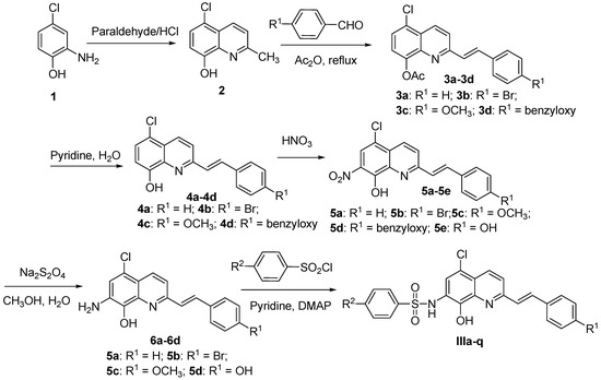 General Procedure for the Synthesis of (E)-N-(2-substituted-styryl)-5-chloro-8-hydroxyquinolin-7-yl)-benzenesulfonamides III