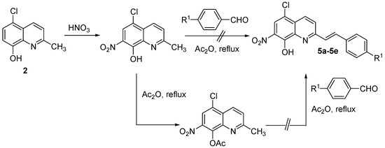 During the synthetic processes, the construction of the styryl scaffold by Perkin condensation reaction between 2-methylquinoline derivatives and various aldehydes was one of the key steps. According to a modified procedure [5,6], the 5-chloro-2-styrylquinolin-8-ols 4a-4d were isolated in 32–57% yield by column chromatography. It is noteworthy that the smooth Perkin condensation is likely dependent on the nature of the 2-methylquinoline component. In an initial attemption to construct the styryl scaffold, we tried to carry out Perkin conditions with 5-chloro-2-methyl-7-nitro-quinolin-8-ol, but after refluxing in acetic anhydride for 7 days, no condensation product was detected and only 5-chloro-2-methyl-7-nitroquinolin-8-yl acetate was isolated (Scheme 2).