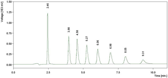 Additionally, the HPLC analysis was carried out for individual compounds. A newly developed HPLC method was able to distinguish among all prepared quaternary pyridinium salts (Figure 2). The shortest retention time was found for the C8 pyridinium salt. This novel HPLC method could be easily used for characterization of mixtures of pyridinium detergents.