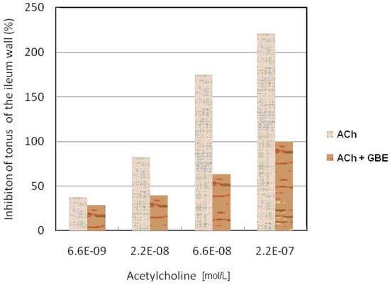 Pendular movements represent spontaneous rhythmical contractions and relaxations of the longitudinal muscular layer that mostly occur by electric activities of the smooth muscle cells themselves. The spontaneous activity is modified by numerous neurotransmitters of the enteric nervous system [9]. This neural plexus that is located in the bowel wall contains a larger number of neurons, and the most common neurotransmitter in it is ACh. Thus, motility and secretion of the gastrointestinal tract are mostly under the influence of cholinergic neurons [10,11]. Our results show that GBE expresses acute effects on the motility of the intestinal tract, strongly reducing the spontaneous activity of both the ileum and the colon. The effects of GBE are concentration-dependent in the examined colon parts. However, GBE does not have the same effect on the tonus of the ileum and the colon intensified by ACh. In the presence of GBE, the effects of ACh in the ileum are reduced and they are unchanged in the colon.