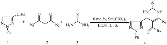 Due to their unique biological properties, 1,2,3-triazole derivatives have attracted much attention [35]. In continuation of our interest in Lewis acid applications for dihydropyrimidinones and ultrasound-assisted synthesis [36], herein we report the preparation of 4-(2-phenyl-1,2,3-triazol-4-yl)-3,4-dihydropyrimidin-2(1H)-(thio)ones from 1,3-dicarbonyl compounds, 2-phenyl-1,2,3-triazole-4-carbaldehyde and urea or thiourea in the presence of Sm(ClO4)3 under ultrasound irradiation (Scheme 1). In this work, an efficient method for the synthesis of target compounds is described and none of them have been reported yet in the literature.