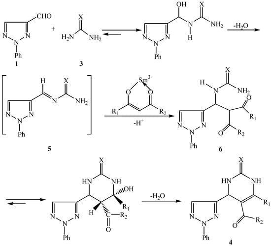 Using these optimized reaction conditions, the reaction of various 1,3-dicarbonyl compounds, 2-phenyl-1,2,3-triazole-4-carbaldehyde and urea or thiourea using Sm(ClO4)3 as catalyst under both ultrasound irradiation and conventional conditions were investigated. The results are summarized in Table 2. It was found that all the reactions proceeded smoothly to give the corresponding 4-(2-phenyl-1,2,3-triazol-4-yl)-3,4-dihydropyrimidin-2(1H)-(thio)ones in good yields. Compared to the conventional heating method, the achieved yields under ultrasound irradiation increase six or eight percent and only one-third of the reaction time need. According to the mechanism suggested by Kappe [37], a proposed reaction mechanism of Biginelli condensation via acyl imine intermediate 5 is presented in Scheme 2, this intermediate is formed by the reaction of the 2-phenyl-1,2,3-triazole-4-carbaldehyde 1 and urea or thiourea 3 and then stabilized by Sm(ClO4)3 through a coordinate bond owing to its empty orbital. Subsequent addition of the iminium ion to ethyl acetoactate in the presence of Sm(ClO4)3 as catalyst produces an open chain ureide 6 which subsequently undergo cyclization and dehydration to afford the corresponding dihydropyrimidinone 4.