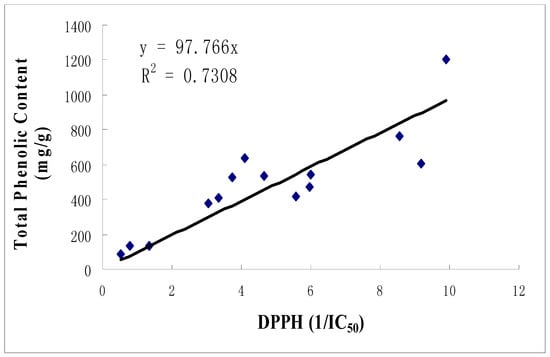 The correlation between total phenolic content and DPPH scavenging activity for ethanolic extracts was observed to be high, with a correlation, R2=0.7308 (Figure 1) indicating that phenolic compounds may be the major contributor of the scavenging activity of the extracts. This has been shown in other studies where antioxidant capacity of plant extracts correlated well with the total phenolic content [,,].