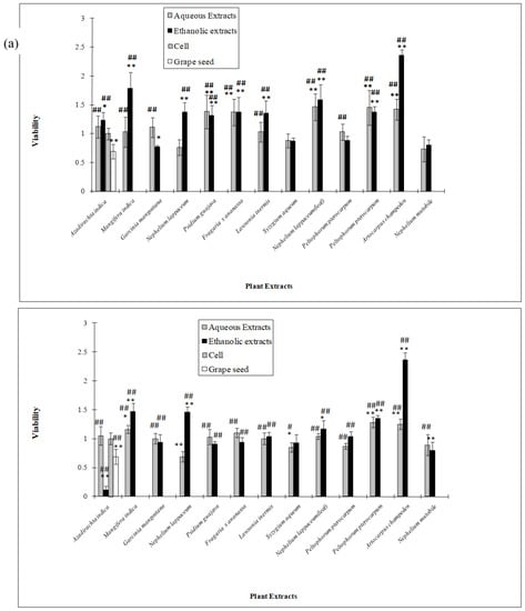 In the cytotoxicity studies, 3T3 (mouse embryonic fibroblasts cell) and 4T1 (mouse breast cancer cell) were used. 3T3 cell is widely used to study the cytotoxicity effect of compounds and plants in in vitro models [,]. 4T1 cell is well established in our laboratory to evaluate the antiproliferative effect of extracts as a potential anticancer agent. Most of the ethanolic and aqueous extracts did not exhibit any anti-proliferative effects on 4T1 and 3T3 cells at both 50 µg/mL (data not shown) and 100 µg/mL, as shown in Figure 2a and 2b. However, Azadirachta indica leaf ethanolic extract showed significant inhibition of cell proliferation of 4T1 cells. The results indicate that the extract may have anti-cancer properties (Figure 2a) and was shown in previous studies where Azadirachta indica leaf preparation was found to activate natural killer (NK) cells (CD56+CD3−) to enhance their cytotoxic ability to tumor cells and stimulate the release of interleukin-12 (IL-12) from macrophages from healthy individuals and head-and-neck squamous cell carcionoma patients []. Almost all the ethanolic and aqueous extracts were not toxic to the cells at 100 µg/mL. In fact, ethanolic and aqueous extracts of Artocarpus champeden were seen to promote cell proliferation.