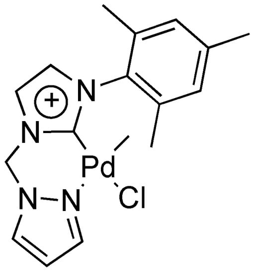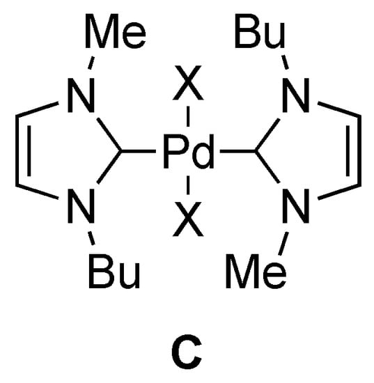 - Wang, R.; Twamley, B.; Shreeve, J. A highly efficient, recyclable catalyst for C–C coupling reactions in ionic liquids: pyrazolyl-functionalized N-heterocyclic carbene complex of palladium(II). J. Org. Chem. 2006, 71, 426–429. [Google Scholar] [CrossRef] [PubMed]