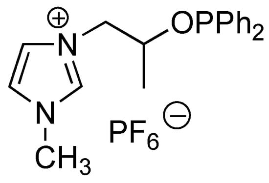 In this contest, it has been shown [42] that the use of an imidazolium based phosphinite IL (Figure 4) as solvent and as ligand in the coupling reaction of aryl halides (including chlorobenzene) with styrene and butyl acrylate allows the synthesis of the expected product in high yield (generally, around 90% also for ArCl) assuring also a high recyclability (six runs without losing its efficiency). Although the crystal structure of the catalyst was not reported, the formation of a carbene-type complex was excluded on the basis of the 1H NMR spectrum, and a ML2 complex was hypothesized.
