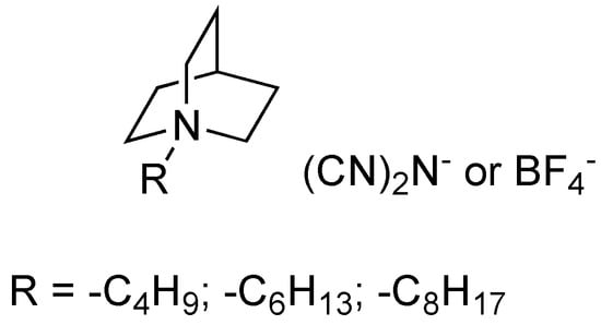 - Chiappe, C.; Melai, B.; Sanzone, A.; Valentini, G. Basic ionic liquids based on monoquaternized 1,4-diazobicyclo2.2.2octane (dabco) and dicyanamide anion: Physicochemical and solvent properties. Pure Appl. Chem. 2009, 81, 2035–2043. [Google Scholar] [CrossRef]