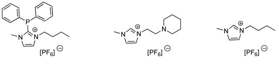 But the functionalization of the imidazolium ring not necessarily have to involve the C(2) imidazolium carbon. Substituents able to interact with palladium(II) have been introduced also on the imidazolium nitrogen. Pyrazolyl-functionalized 2-methylimidazolium based ILs have been therefore synthesized and the activity and recyclability of the palladium complexes have been evaluated [36] (Figure 1).