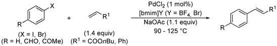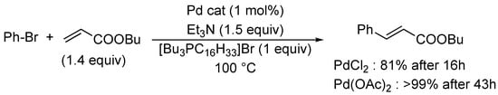 Simple palladium salts such as PdCl2 or Pd(OAc)2 in the absence of stabilizing phosphine ligands have been widely used in the Heck reaction in ILs [10,11,12,13,14], and preparatively significant examples have been performed.