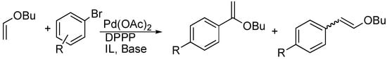 An extensive investigation on Pd-catalyzed Heck reactions in imidazolium based ILs has been performed by the research group of Xiao. In 2000, they published [29] a detailed study on reaction of iodobenzene with styrene and acrylates catalyzed by Pd(OAc)2, showing for the first time that the imidazolium cation can react with a catalyst precursor to form N-heterocyclic carbene complexes via deprotonation in the imidazolium-based ionic liquids under catalytic conditions, and that the carbene complexes so generated are active for C-C bond coupling reactions. Subsequently, they focused on the palladium catalyzed arylation of the electron-rich olefins, such as butyl vinyl ether in [bmim][BF4], using aryl iodides and bromides as the arylating agents. The results of these studies, reviewed in 2008 [30], showed that imidazolium ILs in combination with the readily available Pd(OAc)2 and 1,3-bis-(diphenylphosphino)propane (DPPP) form an excellent catalytic system, in which highly regioselective and yielding arylation of electron reach olefins can be performed with a wide range of aryl halides with no need for any halide scavengers (Scheme 10).