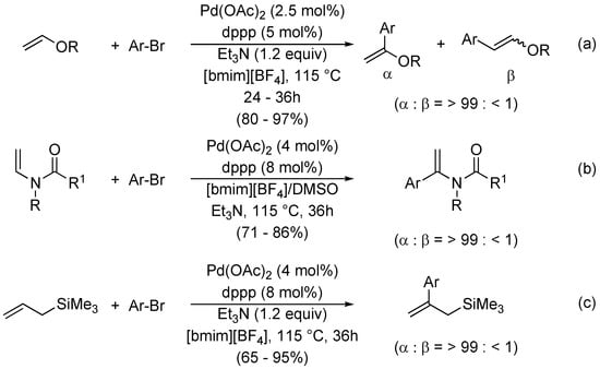 - Mo, J.; Xu, L.; Xiao, J. Ionic liquid promoted, highly regioselective Heck arylation of electron-rich olefins by aryl halides. J. Am. Chem. Soc. 2005, 127, 751–760. [Google Scholar] [CrossRef] [PubMed]