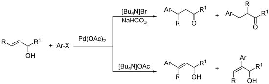 A similar stabilization of the active Pd catalytic species was invoked by Muzart and co-workers, who employed NaHCO3 as the base and PdCl2 as the catalyst precursor in a Heck arylation of allylic alcohols in [Bu4N]Br, affording β-arylated carbonyl compounds (Scheme 6) [24].