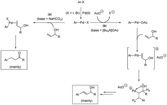 In particular, when [Bu4N]Br is used as solvent, and a conventional base such as NaHCO3 is employed, ligand X will be bromide or iodide anion (path a) and the reaction follows the neutral pathway (path a). For steric reasons, the migratory insertion of the aryl group predominantly occurs to the β-position of the alkenol, giving rise to β-arylated carbonyl products.