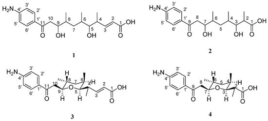 In the course of ongoing investigations on natural products for the metabolic relationship between mangrove plants and their endophytes, an actinomyces (strain HK10552) was isolated from the leaves of A. corniculatum (Aegicerataceae). This strain produced four new p-aminoacetophenonic acids, whose derivatives were previously isolated from a mangrove endophyte Streptomyces griseus subsp. [10], namely (2E)-11-(4′-aminophenyl)-5,9-dihydroxy-4,6,8-trimethyl-11-oxo-undec-2-enoic acid (1), 9-(4′-aminophenyl)-3,7-dihydroxy-2,4,6-trimethyl-9-oxo-nonoic acid (2), (2E)-11-(4′-aminophenyl)-5,9-O-cyclo-4,6,8-trimethyl-11-oxo-undec-2-enoic acid (3) and 9-(4′-aminophenyl)-3,7-O-cyclo-2,4,6-trimethyl-9-oxo-nonoic acid (4) (Figure 1), along with several known compounds, like 4-methylamino-benzoic acid, methyl-2-(2-hydroxyphenyl)acetate, 4-hydroxybenzoic acid, (2E)-3-(4-hydroxy-3-methoxyphenyl)-2-propenoic acid, methyl-2-(1H-indol-3-yl)acetate, (2E)-(4-hydroxyphenyl)-2-propenoic acid, (2E)-(4-hydroxyphenyl)-2-propenoic acid, 1H-indole-3-acetic acid, indole-3-carboxylic acid, cyclo(phenylalanyl-seryl)-3,3-bis(30-indolyl)propane-1,2-diol and 2-hydroxybenzeneacetic acid. In this paper, we report the structural elucidation of the new p-aminoacetophenonic acids 1–4.