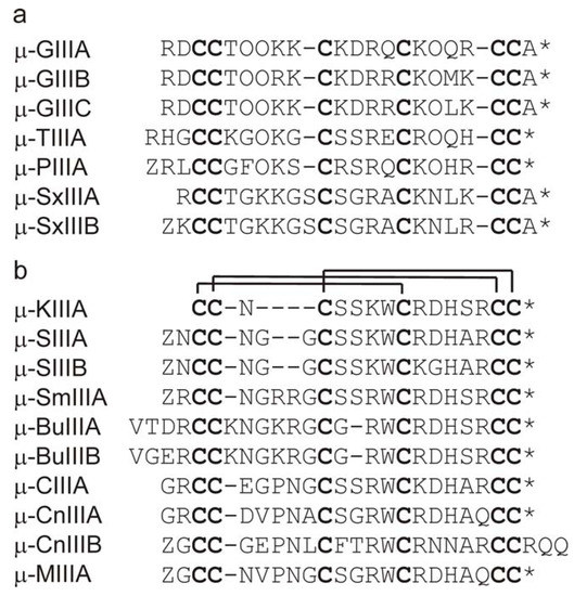 μ-Conotoxins contain 16-25 residues, with six Cys residues arranged in a class III framework [5,14]. They belong to the M-superfamily of conopeptides, specifically the M-4 and M-5 branches of this superfamily [15,16], which are defined as such based on the number of residues in the third loop, separating the fourth and fifth half-cystine residues (Figure 1). The M-4 branch includes κM- and ψ-conotoxins, which target other classes of ion channel [5,14], as well as μ-conotoxins, whereas the M-5 branch consists exclusively of μ-conotoxins [16]. The μ-conotoxins GIIIA and GIIIB from Conus geographus were among the first to be characterized. μ-GIIIA specifically blocks skeletal muscle Na+ channels (NaV1.4), having significantly lower affinity for other Na+ channel subtypes [26,27,28]. μ-GIIIA and μ-GIIIB have a rather complex interaction with the Na+ channel pore, with several residues in the toxin contributing to high affinity binding. Arg13 (the conserved Arg in the second inter-cysteine loop) is particularly important [27,29,30] as it occupies the mouth of the channel and inhibits Na+ flux by acting as both a steric and electrostatic barrier [12,31,32]. The replacement of numerous other residues of μ-GIIIA affects its function, indicating that many parts of the toxin surface interact with the Na+ channel [33,34]. μ-GIIIA therefore differs from the Na+ channel-blocking guanidinium toxins, TTX and STX, which appear to occlude the narrow part of the pore [32,35].