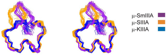 Stereo views of families of 20 final structures of μ-KIIIA (blue) [BMRB accession number 20048] [40], μ-SIIIA (orange) [BMRB accession number 20023] [41] and μ-SmIIIA (purple) [PDB ID 1Q2J] [42], superimposed over backbone heavy atoms (N, Cα, C’) of residues 4-16 for μ-KIIIA (residues 8-20 for μ-SIIIA and residues 10-22 for μ-SmIIIA).