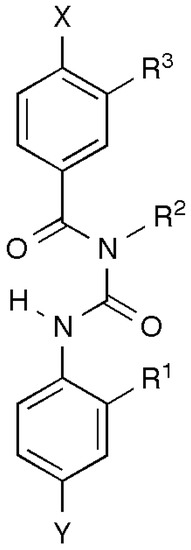 Schematic of a helical mimetic scaffold. This shows a benzoylurea scaffold decorated with three substituents, R1, R2 and R3, which could mimic key functional side chains from the helical region of a µ-conotoxin such as µ-KIIIA or µ-SIIIA. X and Y can be any substituent, including additional aromatic rings.