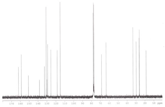 Figure 2 and Figure 3 show typical examples of 1H-NMR and 13C-NMR spectra, corresponding to diol 2b. In the 1H-NMR spectrum, the methylene protons in (HO-CH2-) and (Ph-O-CH2-) appear at 3.57 ppm and 4.05 ppm, respectively. This is similar to the data that obtained by Stamatoiu et al. [8]. The singlet peak at 8.65 ppm is assigned to the azomethine (-CH=N-) group [9]. The azomethine group appeared at higher field because the nitrogen atom is bonded to an aromatic ring and the nitrogen has a lone pair of electrons which enables it to delocalize into the aromatic ring. The bands of the -OH protons are not detected due to overlap with C-H protons. However, we further confirm formation of hydroxyl group by FT-IR which indicates the absorption band at 3,420 cm-1. 1H-NMR data for the diols 2(a–d) are given in the Experimental section and the properties are summarized in Table 1.