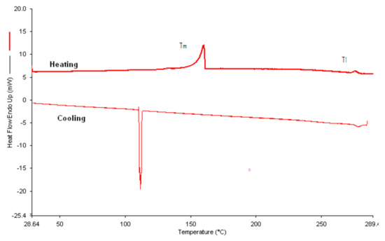 The mesophases of the diols 2(a–d) were studied by polarizing optical microscope (POM) and differential scanning calorimetry (DSC). Table 2 shows the mesophase confirmation and the transition temperatures for diols 2(b–d). DSC analysis was carried out for all diols obtained and Figure 4 shows the observed transition temperature for diol 2b. The crystal phase to nematic phase transition temperature (Cr-N) and nematic phase to isotropic phase transition (N-I) temperature is observed under POM. When the diols are observed under POM at 5 °C/min (to correlate with the DSC rate), the results revealed that the diols 2b, and 2d exhibit a nematic liquid crystal phase, diol 2c exhibits a smectic liquid crystal phase, whereas diol 2a do not show any liquid crystalline behavior, but simply changes from a solid to an isotropic fluid. Compounds that exhibit liquid crystalline behavior are due to their high aspect ratio (length to breadth ratio). The POM images for all obtained compounds are shown in Figure 5. It is worth mentioning that similar studies have been done on liquid crystals with four aromatic rings in the rigid core and when a three and four carbon alkyl chain is added to its terminal end they did not exhibit liquid crystal phases [4]. The addition of the flexible chain length decreased the melting point of these diols. This observation is supported by the previous research [10,11,12]. The lateral substituents introduced into mesogen molecules depress the thermal stability of the mesophases, it is due to the overall anisotropic broadening of the molecule will influence cooperative packing needed in the structures that form mesophase [13,14].