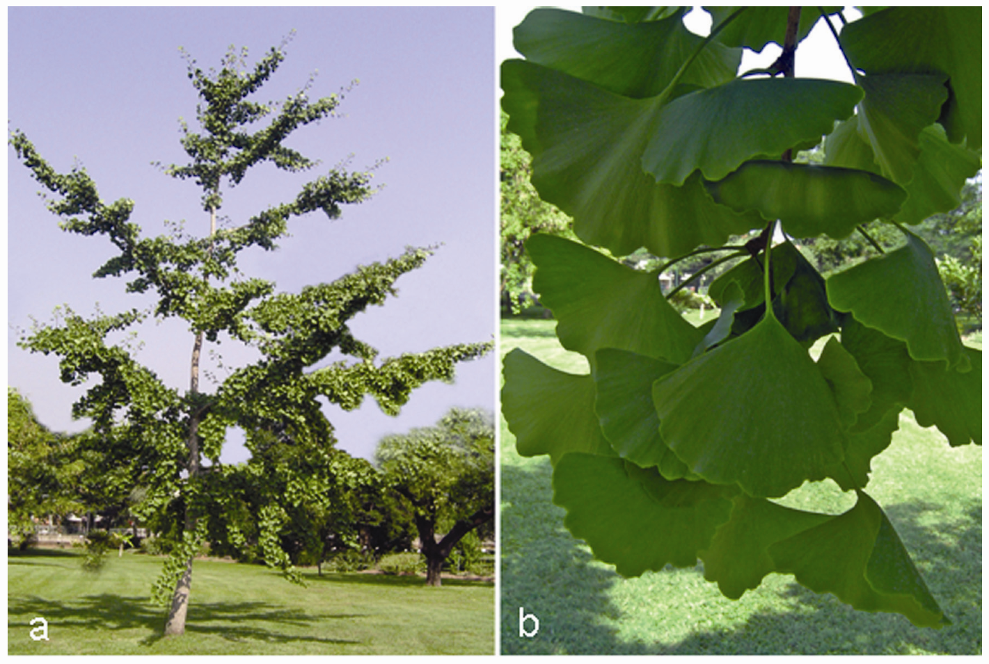 From the Chinese term Ginkyo meaning silver apricot, due to its yellow seeds, it is a tall and ancient tree (Figure 1a) with a remarkable long life span of more than 4,000 years due, at least in part, to its high tolerance to abiotic/environmental stresses and resistance to pathogen infections. This species, belonging to the Ginkgoaceae family, is considered a ‘living fossil’ because of its primitive characters and absence of close living relatives [71]. The medical use of this plant can be traced back to approximately 5,000 years to the origins of TCM. Modern Chinese pharmacopoeia introduced Ginkgo leaves, typically fan-shaped (Figure 1b), as treatment for vascular insufficiency and to improve longevity, whereas seeds are used as astringent for the lung to treat illnesses like asthma and chronic bronchitis [72].