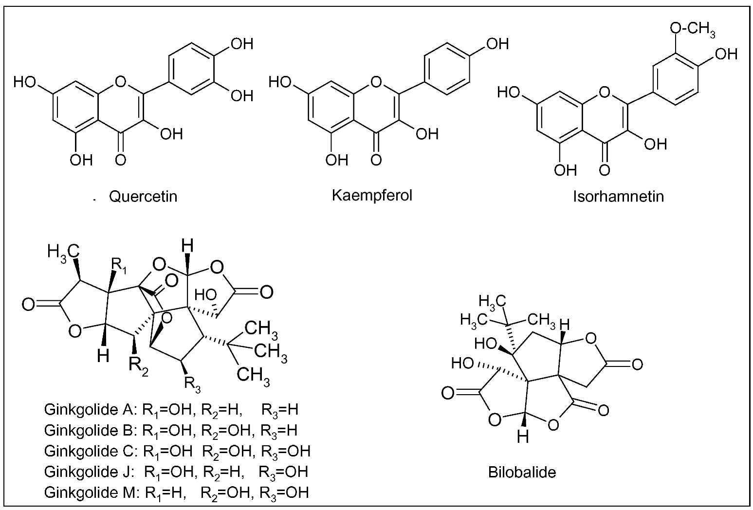 Main flavonoids (quercetin, kaempferol and isorhamnetin), ginkgolides (A, B, C, J, M) and bilobalide of Ginkgo biloba L.
