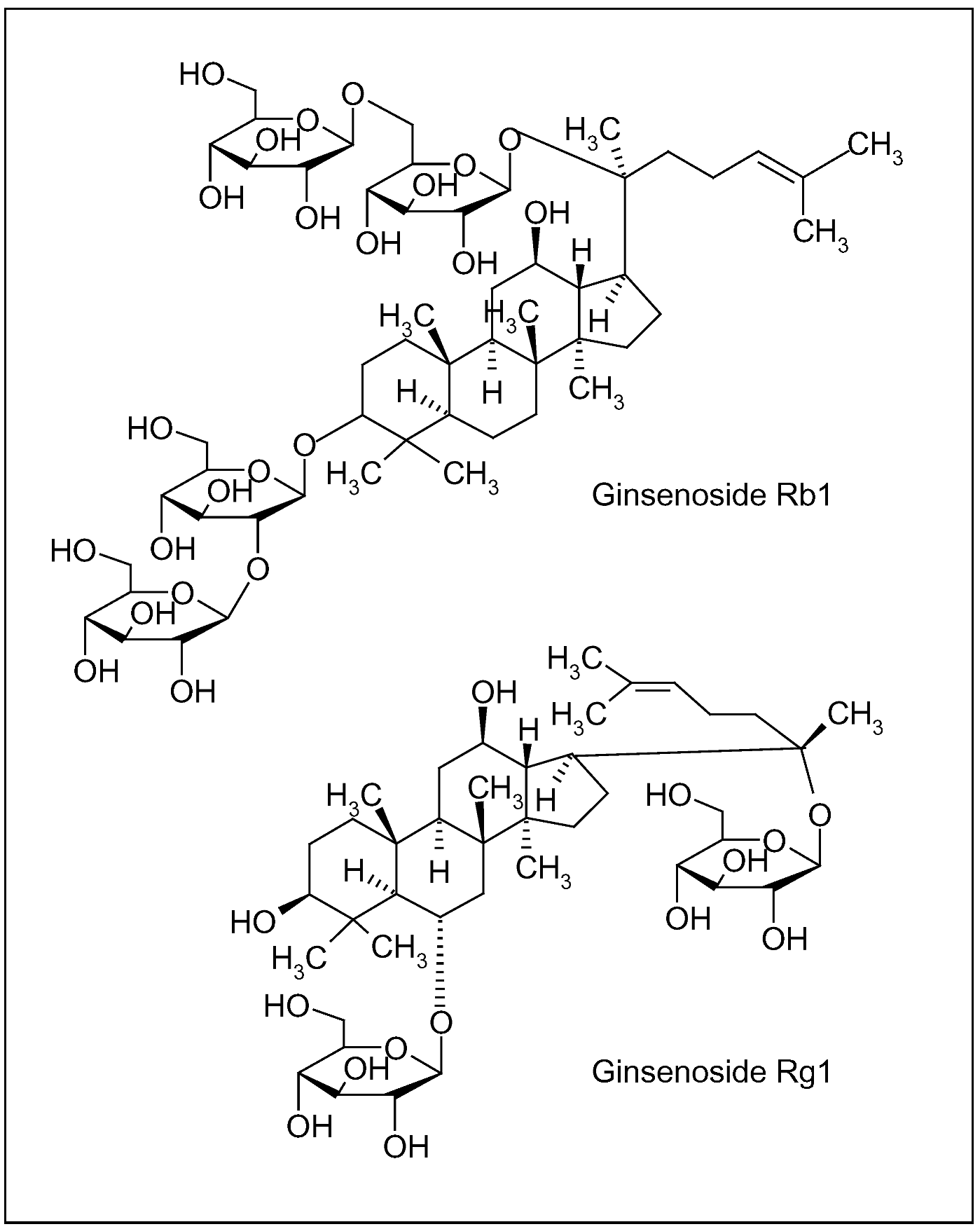 Ginsenosides of Panax ginseng C.A. Meyer root; Rb1 and Rg1 are characterized by different aglycones, protopanaxadiol and propanaxatriol, respectively.