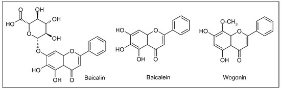 Three main flavonoids, baicalein (5,6,7-trihydroxyflavone), baicalin (baicalein 7-O-glucuronide) and wogonin (5,7-dihydroxy-8-methoxyflavone) (Figure 6), isolated from the root have been assayed for numerous potential benefits [111]. As antioxidant agents, in different cell culture and animal models, these compounds showed to quench ROS, to protect neurons from oxidative damage in cerebral ischemia/reperfusion (I/R) injury, to inhibit lipid peroxidation of neuronal membranes and to prevent excitotoxicity induced by glutamate [112,113,114,115,116,117,118,119,120,121].