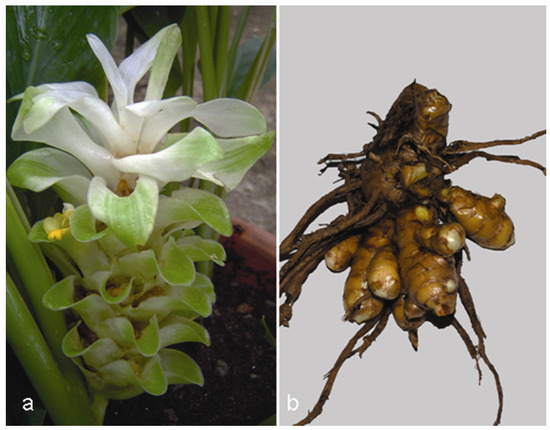 Curcuma longa L.: aerial parts (a) and rhizome (b).
