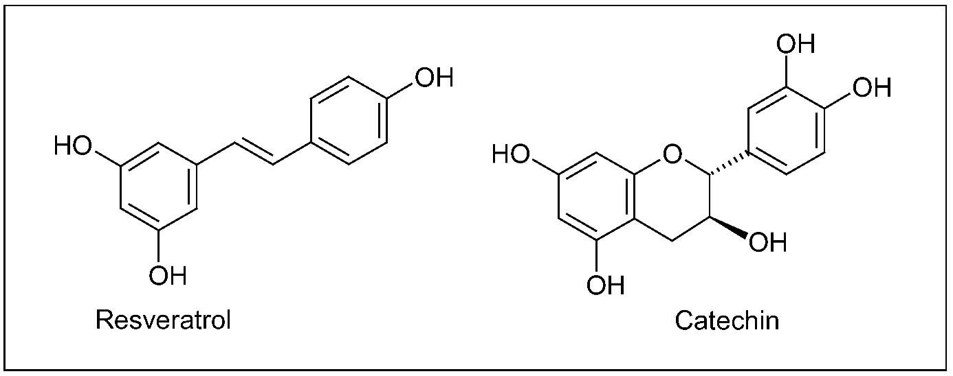 A stilbene (resveratrol) and a flavonoid (catechin) typically present in grape products.