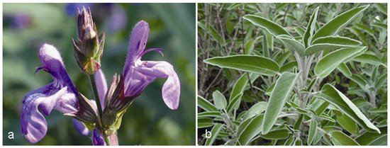 Salvia officinalis L.: flowers (a) and leaves (b).