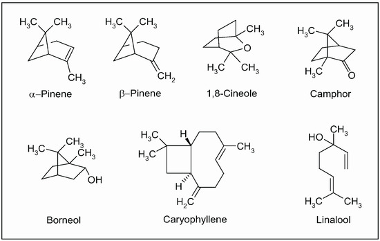 Currently, the health benefits of the Mediterranean diet have also been attributed to the regular consumption of traditional spices, considered as significant sources of bioactive phytochemicals [193,194,195,196,197]. In particular, many pharmacological studies on sage has been performed on volatile constituents (essential oils). The in vitro anticholinesterase activity of S. officinalis and S. lavandulaefolia (Spanish sage) was reported in both human erythrocytes and brain tissues (post-mortem) [198,199]. This activity was attributed to the synergy among monoterpenes present in essential oil, mainly α- and β-pinene, 1,8-cineole, camphor, borneol, caryophyllene and linalool (Figure 12). Additionally, pure compounds from the extract were tested, none of which fully accounted for the activity of the essential oil [198,200,201].