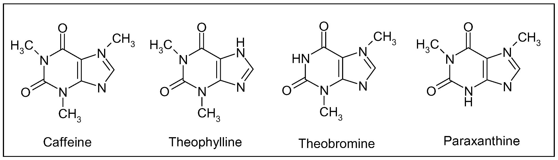 Caffeine and structurally related methylxanthines found primarily in tea (theophylline) and chocolate (theobromine); paraxanthine is the main hepatic metabolite of caffeine after coffee ingestion.